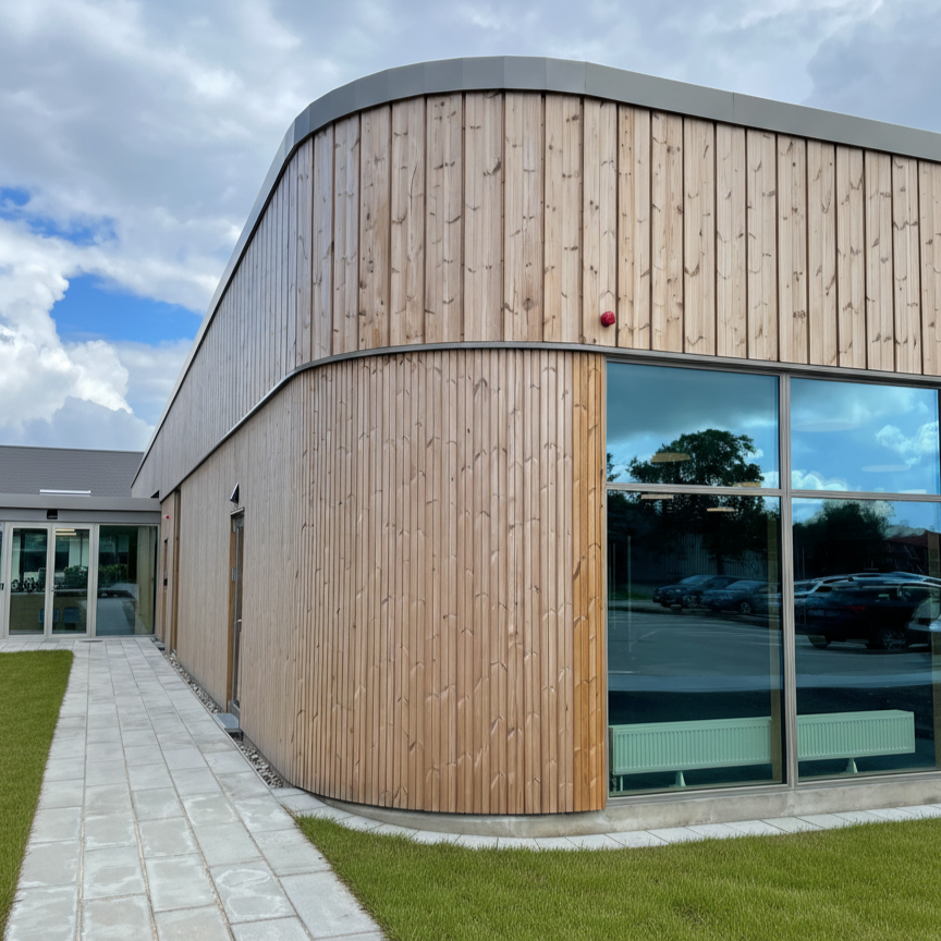 Arkitekturen er præget af en enkel og robust formgivning med fokus på lang levetid og funktionel klarhed. Træ anvendes som et gennemgående materiale og bidrager til en varm og imødekommende atmosfære i de store rum. Store glaspartier sikrer dagslys og skaber visuel kontakt mellem inde og ude, så hallen opleves åben og integreret i sine omgivelser.