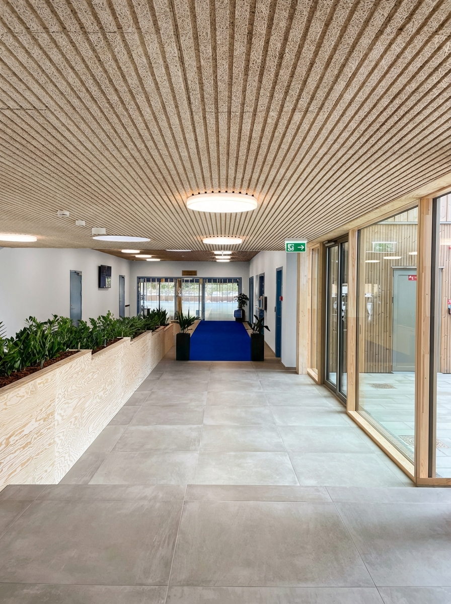 Materialer og løsninger er valgt med blik for daglig brug, komfort og slidstyrke, og hallen fremstår som et funktionelt byggeri med høj brugsværdi. Projektet samler funktion, kvalitet og holdbarhed i en arkitektonisk helhed, der styrker gymnasiets rammer og skaber plads til både bevægelse og fællesskab.