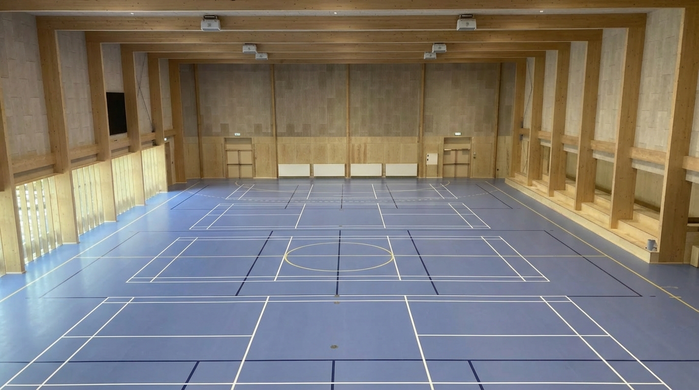 Bygningen rummer en håndboldbane i fuld størrelse med mulighed for opdeling til badminton og volleyball, så rummet kan tilpasses forskellige aktiviteter og brugergrupper. Langs den ene side er der etableret tribuner, der giver plads til tilskuere og fælles samlinger, mens integrerede storskærme understøtter undervisning og formidling. Den klare disponering skaber overskuelige forbindelser mellem aktivitet, ophold og undervisning og giver hallen en tydelig og logisk struktur.